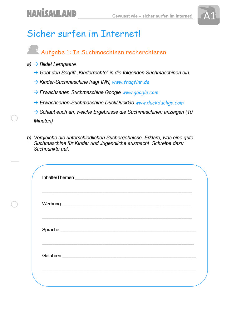 In diesen Arbeitsblättern geht es um die Vorteile beim Recherchieren in Kinder-Suchmaschinen, die Risiken von Downloads und Online-Käufen und um die Funktion des Impressums, das wichtige Hinweise über die Absichten und die Seriosität einer Internetseite enthält.